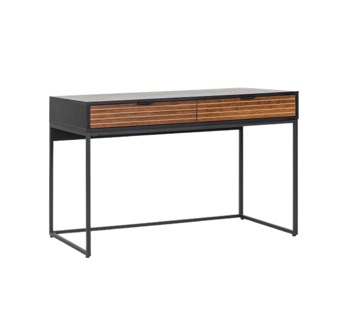 Fabricado en melamina color nogal con frentes de melamina nogal ranurados. Cuenta con 2 cajones cuenta con 2 cajones de guardado para que puedas organizar todo lo que necesites en un solo lugar de la manera más cómoda ya que cuenta con jaladeras metálicas negras. Resistente estructura metálica color negro en la base, que brinda firmeza, Compleméntala con la silla de silla de tu agrado. La dosis perfecta de comodidad y buen diseño.