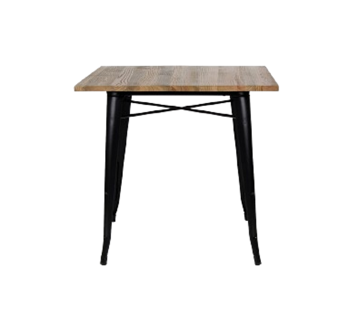 La calidez de la cubierta de madera al natural se complementa con la base de acero en color negro.